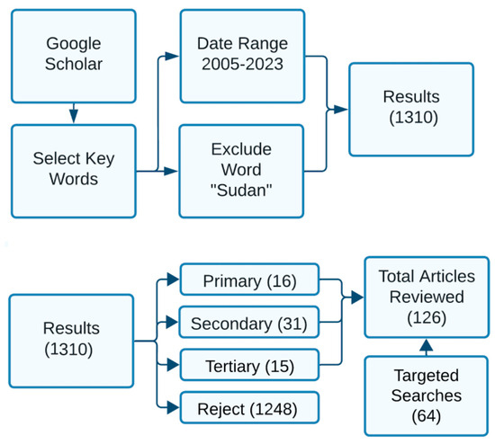 The main body of research found in this project was completed using a systematic literature review and targeted searches (Figure 1). This review was completed by searching a predefined set of keywords in Google Scholar and then reading the abstract of the results and categorizing the articles. The keywords used were Addis Ababa, condominium, water, consumption, and distribution. Two filters were applied to the search results to enhance the relevance of the results. The first filter was a time frame from 2005 to 2023. This filter was based on the date that the condominium project was implemented. The second filter was applied from 2005 to 2007 and excluded the word “Sudan”. This was carried out to reduce the number of irrelevant results related to South Sudan. As South Sudan achieved its independence in 2005, the surge in developmental activities and its proximity to Ethiopia could have been the reason for the Google Scholar search results we had to exclude.
