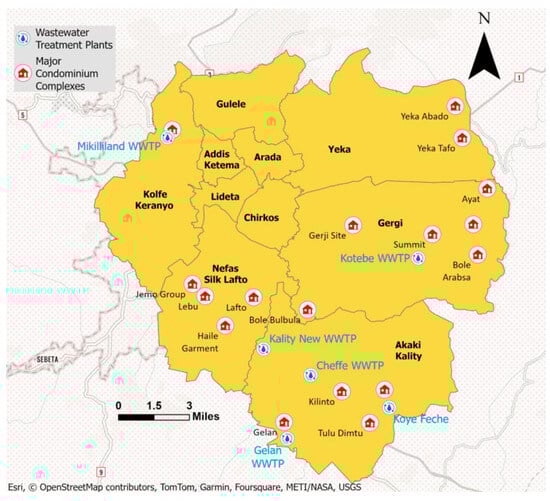 A sub-city level map of Addis Ababa with major condominium complexes and wastewater treatment plants shown. Sub-city names are bolded for easier reference.