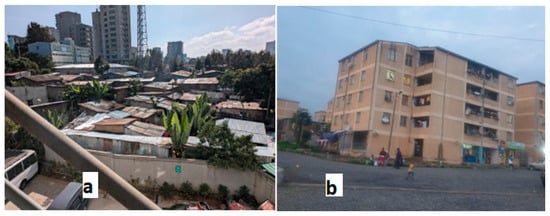 A group of Kebele houses in the Kazanchis area (a) and a condominium building in the Ayat condominium complex (b). Photo credit: (a) Tesfayohanes Yacob (2024) and (b) Amha Sertse (2024). Used with permission.