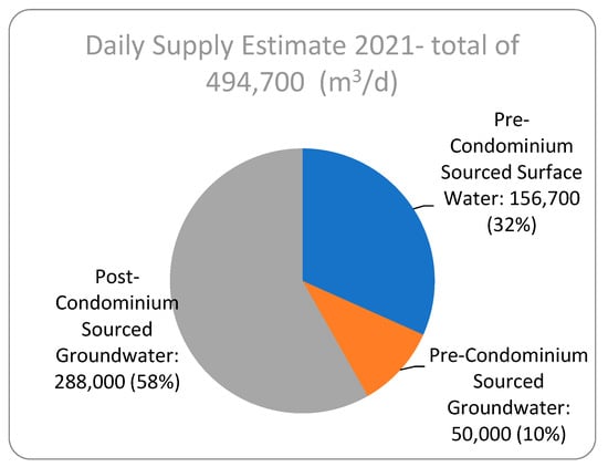 The city of Addis Ababa continues to utilize both surface water and groundwater to meet water consumption needs [51]. With the growing population, AAWSA had to increase its overall water supply to meet the growing demand. The city’s surface water resources as of 2021 are the Gefersa, Dire, and Legedadi dams. These are combined with the groundwater resources consisting of the Legedadi wellfield, the Akaki wellfield, and other smaller wells within the city [51,52]. A further breakdown of the city’s water resources can be found in Figure 4 and Figure 5. As of 2021, the overall water production from these water sources is estimated to be between 447,333 and 542,000 m3/d [37,52]. Post 2000, all newly added water supply projects have been groundwater well projects with a total of 288,000 m3/d [37,52]. As of 2021, thus, around 68% of Addis Ababa’s water supply comes from groundwater sources [37,52]. Figure 4 summarizes the source and capacity of water supply as of 2021. The calculated average water production for the city in 2021 (494,700 m3/d) is over double compared to what it was in 2005 during the pre-condominium era (220,000 m3/d) [28,37,52]. The difference in water production between these periods is calculated to be 274,667 m3/d. This vast increase in water production from 2005 to 2021 is a direct response to the expanding population of Addis Ababa, the increasing construction and business water demands, and the post-condominium increased water demand at the household level. In 2005 the population of Addis Ababa was estimated to be 2.643 million; in 2021 that estimate rose to 3.774 million [4,10]. Within these 16 years, there was approximately a 1.130 million-person increase in the population.