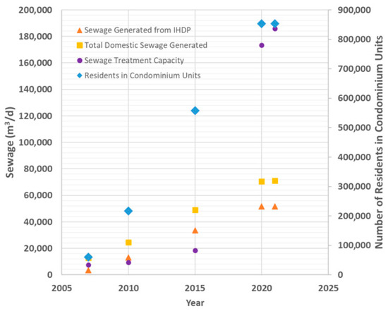 The domestic sewage generated from IHDP, total domestic sewage generated, installed sewage treatment capacity, and the number of IHDP residents for the years 2007 to 2021.