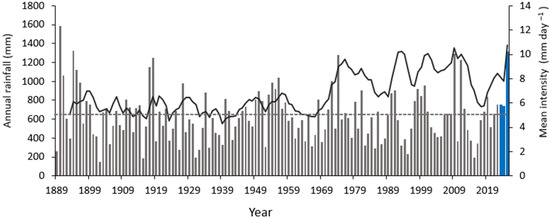 Annual rainfall derived from the Scientific Information for Land Owners (SILO) 5 km gridded dataset, using the single grid cell that covers the study area (i.e., a gridded estimate at 5 km areal support, not a point gauge). Grey bars: annual totals (mm) since 1889. Blue bars: annual totals during the study period. Grey dashed line: long-term yearly mean rainfall (mm). Orange line: 5-year moving average of the daily rainfall intensity (mm day−1) computed from the same grid cell to illustrate multi-decadal variability.