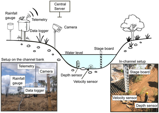 In each gully, a tipping-bucket rain gauge (Hyquest TB7; HyQuest Solutions, New South Wales (NSW), Australia) with a resolution of 0.2 mm per tip was installed near the terminus of gully. To measure runoff depth in the outlet channel, a Submersible Level and Temperature sensor (SBLT; Dwyer Instruments, Michigan City, IN, USA), which uses a pressure transducer to measure hydrostatic pressure and calculate water depth, was deployed. SBLT tubes were installed vertically with tips sitting approximately 0.1 m above the active channel bed. Measurements of the height were taken after runoff events to account for the changes in vertical bed movement. The velocity of surface runoff was measured using velocity sensor (Starflow; Unidata, Western Australia, Australia). All hydrological equipment was connected to LoggerNet 4.1 for digitization and data storage at a frequency of 0.1 Hz, with the data simultaneously transmitted to an online server via telemetry (Figure 3). An optical camera (Tapo C310 Link; TP-Link, Rydalmere, NSW, Australia) with a frame rate of 30 fs−1 (frames per second) was installed in all five gullies to: (1) visually measure water depth using a stage board; (2) estimate surface flow velocities; and (3) provide redundancy for hydrological equipment during periods of malfunction or failure. Hydrological monitoring began in the 2022/2023 wet season for all gullies except L1, where monitoring commenced during the 2023/2024 wet season.