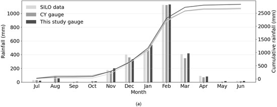 A total of 2830 mm of rainfall was recorded during the study period (3 years), with a mean annual total of 943 mm—higher than the site’s long-term mean (1889 to 2025) of 634 mm year−1 (Figure 5a). Monthly rainfall totals from Scientific Information for Landowners (SILO) and the Continong Yard (CY) gauge, located ~5 km north of the study site, were broadly comparable over the study period, supporting the completeness of the study-site gauge record (Figure 5a). Rainfall was highly seasonal: pooled across the study period, ~95% fell between November and March. February was the monsoon peak (~40% of the total), whereas September contributed only 0.1%. The maximum daily rainfall was 180 mm recorded on 1 February 2025. This 24 h total exceeded the combined three-year rainfall for July, August, September, October, April, May, and June, highlighting the extreme variability of daily rainfall.
