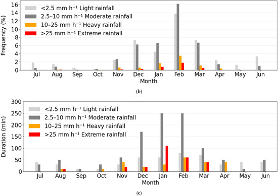 Seasonal variation in rainfall intensity was also evident (Figure 5b). Dry season (April–October) was exclusively dominated by light to moderate rainfall events (<10 mm h−1). Light to moderate rainfall also occurred during the wet season, but heavy to extreme intensity (>10 mm h−1) rain also fell. The duration of each rainfall-intensity category increased from the dry season into the wet season, peaking in January–February (Figure 5c).
