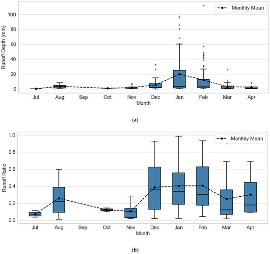 Monthly distribution of (a) Runoff Depth and (b) Runoff Ratio. Data represents a three-year record aggregated from five intensively monitored alluvial gullies. The boxplots illustrate the median, interquartile range, and outliers for each monthly dataset.