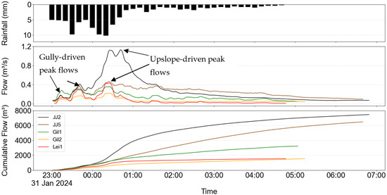 To further investigate the role of upslope contributions, hydrographs from all gullies were analysed for a high-intensity rainfall event on 31 January 2024, during which approximately 100 mm of rainfall was recorded over six hours, with an average intensity of 15 mm h−1 (Figure 9). All gullies responded rapidly to the initial 30 mm h−1 rainfall, exhibiting a runoff response within 15 min. The first peak flow occurred uniformly across gullies, with Gil1 (the largest gully area) registering the highest initial peak at 0.27 m3 s−1. A subsequent increase in rainfall intensity (~60 mm h−1) resulted in a second peak, during which JJ2 and JJ5 surpassed Gil1 in peak flow. The third and highest peak emerged approximately 1.5 h into the event, corresponding to sustained rainfall of 60 mm h-1 over a 20-min window. Notably, JJ2 exhibited a sharp increase in peak flow, nearly quadrupling its second peak value. A key distinction between hydrographs from high-Aca and low-Aca gullies is observed in the third peak. While both groups experienced a rise in flow, the low-Aca gullies rapidly receded to near pre-peak levels. In contrast, the high-Aca gullies maintained elevated flow levels for a significantly longer duration. Cumulative flow data further underscored this divergence: the high-Aca group exhibited a steeper rise in runoff volume and continued flowing for up to two hours after rainfall cessation, whereas low-Aca gullies ceased flowing within 30 min. These findings suggest that gullies with similar areas may exhibit markedly different hydrological dynamics depending on the magnitude of upslope runoff input. Moreover, this divergence appears to be threshold-dependent, with the third peak in hydrographs of high-Aca gullies likely representing a transition from localized gully response to combined gully and upslope catchment-driven runoff.