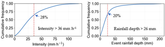 Cumulative frequency of event intensity (Left) and rainfall depth (Right). Dashed vertical lines mark catchment infiltration rate (Left) and modelled rainfall threshold for upslope runoff activation (Right). The proportion of events to the right of each line represents exceedance.