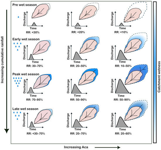 Conceptual diagram showing seasonal variation in the rainfall-runoff processes in alluvial gullies in the Upper Burdekin. The light pink area shows the gully footprint bounded by the catchment envelope in a dashed polygon. The blue color fill shows the area of catchment contribution to the gully runoff. Note the differences in runoff responses (hydrograph) with increasing Aca as catchment wetness or cumulative rainfall increases.