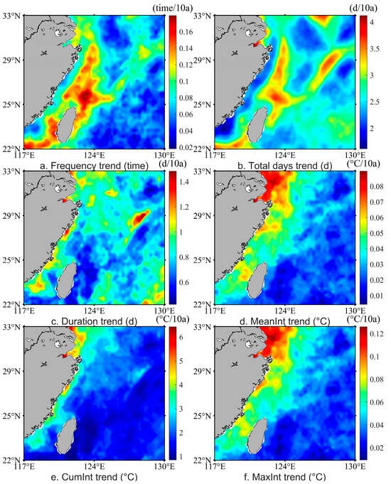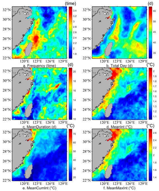 This study investigates changes in surface ocean heatwaves within the East China Sea from 1982 to 2024, utilizing SST data from 1982 to 2011 as the 30-year baseline for the historical climate. Figure 2 presents the analysis outcomes. The figure delineates various metrics associated with MHWs: Figure 2a illustrates the annual average frequency, Figure 2b displays the total number of days, Figure 2c depicts the average duration, Figure 2d indicates the average intensity, Figure 2e summarizes the cumulative intensity, and Figure 2f shows the maximum intensity. The spatial distribution of MHW occurrences across the East China Sea exhibits considerable variability, with an average of 1–4 events per year (Figure 2a). Regions with a high frequency of events, defined as more than three occurrences per year, are primarily located on the continental shelf slope fold zone north of Taiwan and near the Dongsha Islands. These regions are also found in waters west of the Ryukyu Islands. These areas are subject to influences from the branches of the Kuroshio Current and topographic uplift (the topographic uplift effect refers to the dynamic and thermal processes generated when air currents encounter mountainous terrain and are forced to climb along the windward slope), which contribute to persistent temperature anomalies [32]. Conversely, regions experiencing lower frequency—1–2 events per year—are mainly located in the northern mid-latitude waters of the East China Sea and along the Chinese mainland coast. We can attribute this distribution pattern to the temperature buffering effects of coastal upwelling and freshwater input [33].