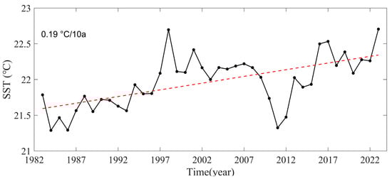 Trends in average SST in the East China Sea from 1982 to 2024. (the black solid line represents the time series of SST from 1982 to 2024, and the red dotted line represents the trend of change).