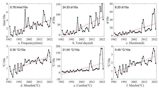 Trends in six MHW indicators from 1982 to 2024. (a) Annual occurrence frequency trend of MHWs; (b) annual total number trend of days of MHWs; (c) annual duration trend of MHWs; (d) annual intensity trend of MHWs; (e) annual cumulative intensity trend of MHWs; (f) annual maximum intensity trend of MHWs. (The black solid line represents the time series of SST from 1982 to 2024, and the red dotted line represents the trend of change).