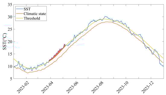Figure 7 depicts the occurrence of the most severe heatwave in the waters proximal to the Yangtze River estuary in 2023. The blue curve represents the time series of SST, whereas the orange curve indicates the climate baseline period. The red curve illustrates the climate state threshold, and the red shaded region emphasizes the most intense heatwave event. Figure 7 demonstrates that the SST variation curve remains relatively stable, with significant deviations from the climate average primarily observed during the summer and winter seasons.