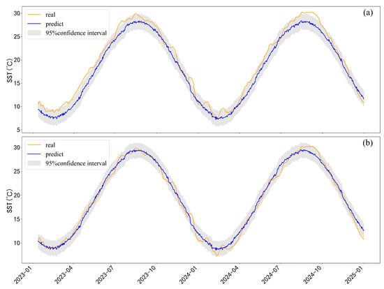 Prediction results of SST in the sea area near the Yangtze River estuary based on the SegRNN model and SegRNN_ST model. The prediction step length is 720 days. (a) shows the prediction results of the SegRNN model; (b) shows the prediction results of the optimized SegRNN_ST model.