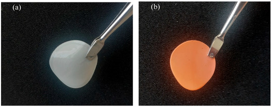 Chitosan is a promising starting material to produce novel catalytic materials. However, its features should be adapted to water treatment in the herein study. The ideal base material must be homogeneous and water-stable to facilitate surface functionalization for water treatment applications. The free amine of chitosan can be an accessible site to allow the aza-Michael addition of a customized catalyst [40,41]. In this respect, the amine group of chitosan has to be deprotonated. A pure chitosan material was then prepared and neutralized with a 1 M solution of NaOH as detailed in the Methods and Materials (M&M) section. Figure 1a shows the resulting pure chitosan material, which appears white and visually homogeneous. In contrast, Figure 1b presents the functionalized material with the iron-based catalyst, exhibiting a distinct color change to red, indicating successful material functionalization.