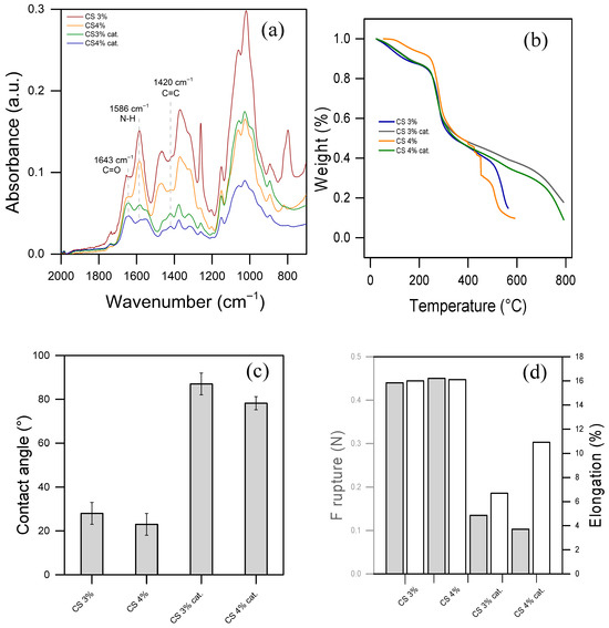 (a) Infrared spectra in ATR mode, (b) thermal gravimetric analysis, (c) water contact angle, and (d) mechanical features: rupture strength (left y-axis, gray bars), percentage of elongation (right y-axis, white bars) of CS 3 and 4% and their functionalized version (CS 3% cat. and CS 4% cat.).