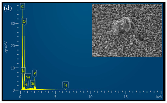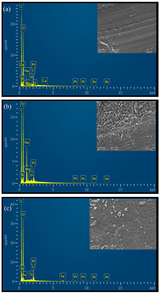 All the prepared materials show a relatively smooth, uniform, and continuous surface morphology under Scanning Electron Microscopy (SEM), as illustrated in Figure 3. The 4% CS film appears slightly rougher than the 3% CS film, potentially due to partial insolubility of CS at higher concentrations in the casting solution. This slight roughness could be a result of incomplete dispersion or aggregation of chitosan chains when more concentrated, leading to small surface irregularities. It is important to note that the SEM images were taken on dry films, so the observed morphology may differ from the material’s microscopic structure in water. In aqueous environments, chitosan films swell and adopt a more hydrated and porous structure, which influences their functional properties, such as permeability. Therefore, while SEM provides valuable insights into the film’s dry-state morphology, additional characterization in hydrated conditions would be useful to fully understand the material’s behavior in applications in water treatments. The EDX spectrum of pure chitosan shows peaks corresponding to carbon (C), oxygen (O), and nitrogen (N), which are the primary elements in the chitosan polymer (Figure 3a,b). The nitrogen peak arises from the amine groups in chitosan, confirming its composition. On the other hand, additional signals corresponding to iron (Fe) were detected in the functionalized film, confirming the presence of the iron-based catalyst bound to the material surface (Figure 3c,d).