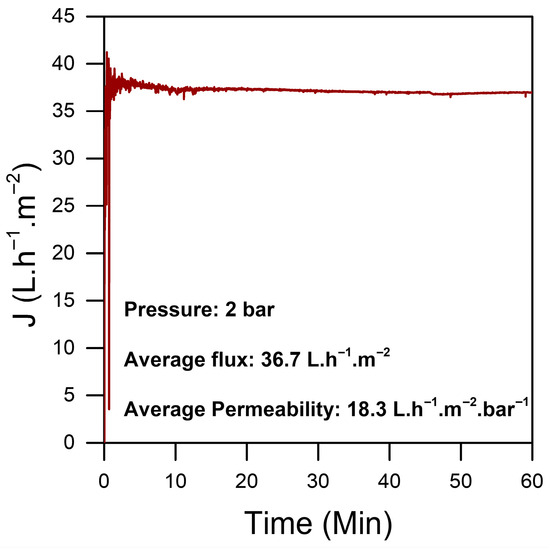 Each test was conducted on randomly cut 2.5 cm2 sections from a 3% pure chitosan sheet measuring 10 × 20 cm. The average permeability was around 20 LMH/bar, with a stable flux maintained over a 2 h testing period under a constant pressure of 2 bar. This stability in permeability and flux highlights the robustness of the chitosan sheet, showing that the material can withstand sustained pressure without altering its permeability characteristics.