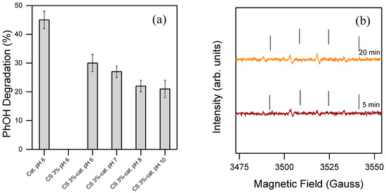 (a) Degradation percentage of PhOH. The reactions were performed at different pH levels in 20 min in the presence of PBS 10 mM, PhOH 0.1 mM, 0.1 mM of the dissolved iron-based catalyst (Cat. pH 6), or 2.5 cm2 of pure CS (CS 3%), and the catalytic material (CS 3% cat.) was used as a catalyst. H2O2 was dosed through 4 stepwise additions of 0.1 mM, each 5 min. The experiments were tripled. (b) EPR spectrum of the radical transient species during the oxidation (conditions: PBS 10 mM, PhOH 0.1 mM, 0.1 mM of the dissolved iron-based catalyst). H2O2 was added once in the reaction system at 0.4 mM. DMPO 17 mM was used as a spin trap, and the spectra were taken after 5 and 20 min of reaction. The results suggest that the active species is ●OH. The reaction took place between H2O2 and PhOH in the presence of the dissolved catalytic core without the acrylamide functions. The ticks in the figure aim only to help the reading of the peaks.