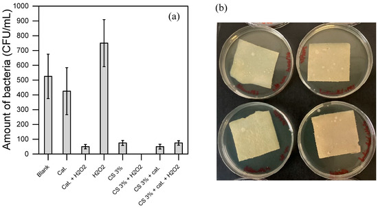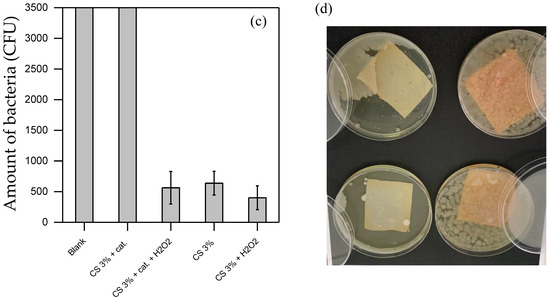 In Figure 6b, the materials’ bacteriostatic capabilities, with and without H2O2, were evaluated. After 3 h of contact, a soft agar solution was poured over the material (Section 2.8). This soft agar environment encourages oxygen diffusion and hence bacterial growth if any adsorbed bacteria remained viable and cultivable, as well as their mobility, making bacterial colonies visible upon growth. In all cases (CS and functionalized CS with or without H2O2), no significant bacterial growth was detected, confirming the bacteriostatic properties of the materials in the tested conditions.