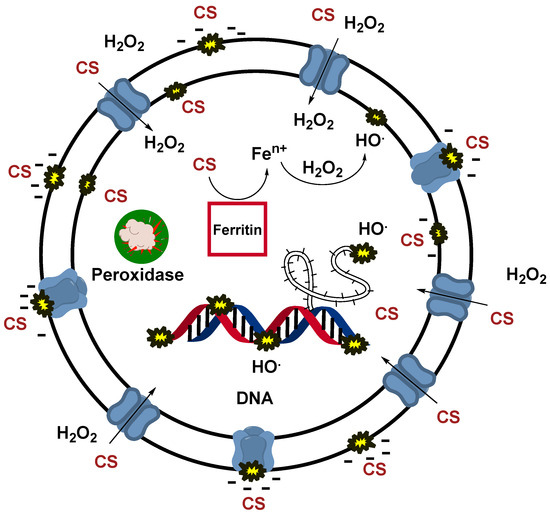 The figure represents a scheme of the possible synergic phenomena involved during the disinfection promoted by CS and CS + H2O2. Thus, it represents the hypothesized action mode of the CS film alone and in cooperation with H2O2. This scheme also depicts the detrimental effects of ROS, as hydroxyl radicals generated by functionalized CS, and how they can affect cellular functions.