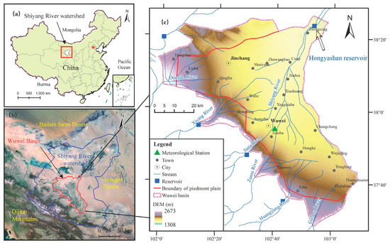 Location of studied area: (a) China in Asia; (b) remote sensing image of the Wuwei basin; (c) DEM (Digital Elevation Model) of Wuwei basin and piedmont plain (recharge zone).