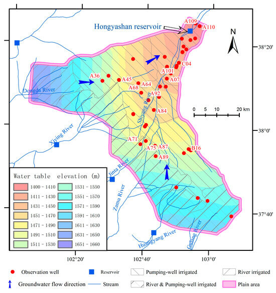 Distribution of observation wells and water table elevation zoning map in the Wuwei Basin.