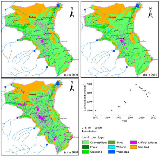 - Wang, L.; Nie, Z.; Yuan, Q.; Liu, M.; Cao, L.; Zhu, P.; Lu, H.; Feng, B. Spatiotemporal Oasis Land Use/Cover Changes and Impacts on Groundwater Resources in the Central Plain of the Shiyang River Basin. Water 2023, 15, 457. [Google Scholar] [CrossRef]