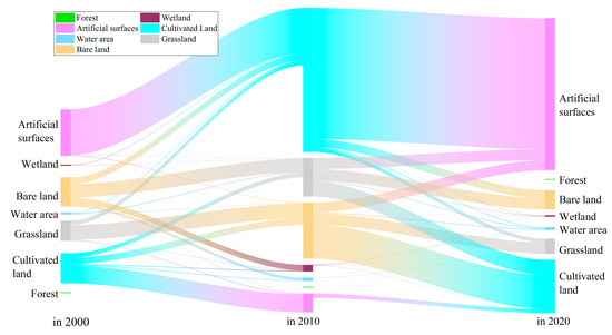 Sankey diagram of land use transitions in the Wuwei Basin (2000–2020).