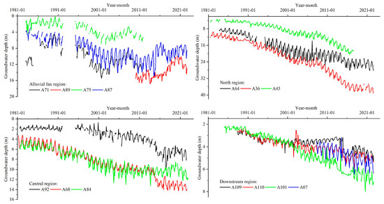 Groundwater dynamics in Wuwei Basin over the past 40 years (1980–2022) exhibited significant spatiotemporal heterogeneity (Figure 5). The piedmont alluvial–pluvial fans had relatively shallow depths in the early 1980s (e.g., Well A75: 1.13 m; Well A87: 3.57 m, Apr 1983) but experienced persistent, slow declines (avg. rate: 0.15 m/yr–0.18 m/yr). Notably, the decline rate varied: 0.07 m/yr–0.14 m/yr pre-1998 versus 0.03 m/yr–0.05 m/yr post-1999. Despite being a surface water–groundwater conjunctive use area with low extraction, the decline is primarily attributed to dual attenuation of natural recharge pathways: (1) Upstream reservoir interception reduced mountain-pass runoff, diminishing lateral recharge; (2) transfer surface water delivered via highly lined canals directly to fields reduced seepage recharge to <20% of natural conditions [31]. This recharge attenuation exceeded the buffering capacity of low extraction, driving persistent decline.