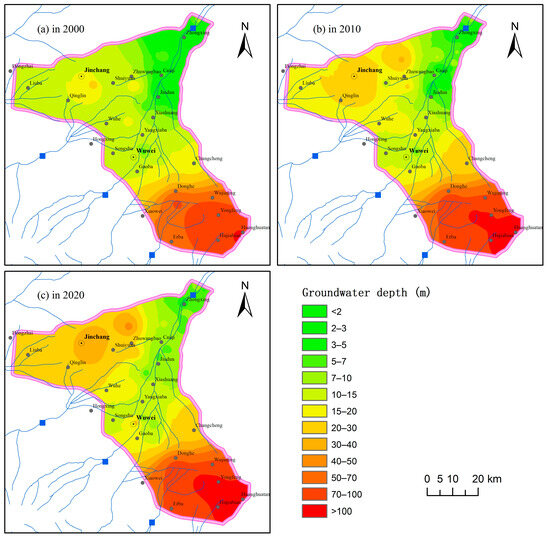 Depth of water table map of the Wuwei Basin in: (a) year 2000, (b) year 2010, and (c) year 2020.