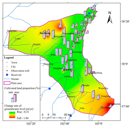 Throughout the basin, cultivated proportion remained consistently high (>50%) from the piedmont recharge zone (alluvial–pluvial fan) towards the basin interior (transition to discharge zone), with relatively limited spatial variation. Conversely, the groundwater level change rate exhibited strong spatial heterogeneity, characterized by a steep gradient of increasing decline rates along the groundwater flow path. This pattern profoundly reflects systematic shifts in aquifer matrix structure and hydraulic properties: from highly permeable, large-porosity gravels in the piedmont recharge zone (facilitating rapid recharge) transitioning to low-permeability, fine-grained sediments (fine sand, silt) dominating the plains (restricting recharge rates). Accompanying this lithologic transition, hydraulic gradient naturally attenuates, natural recharge flux weakens significantly, and the groundwater system’s buffer capacity against sustained extraction declines sharply. The observed stable water levels near the northeastern basin discharge zone (discharge area) further confirm the classic “recharge-flow-discharge” cycle at the regional scale and underscore the critical control of upstream recharge on maintaining water resource equilibrium downstream. This study clearly demonstrates that in arid/semi-arid inland basins like Wuwei, the spatial differentiation of groundwater dynamics is governed not only by land use intensity (e.g., cultivated proportion) but also more fundamentally by the position within the hydrogeological unit and its inherent recharge–flow–discharge mechanisms [16].