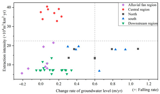 Drawing upon annual groundwater extraction records for irrigation districts spanning 1980 to 2018, alongside contemporaneous groundwater depth measurements, this study computed the multi-year average extraction intensity for each district associated with the observation wells. These calculations were stratified according to periods characterized by either declining or rising groundwater levels. To elucidate the relationship between extraction intensity and groundwater level change rates, scatter plots were generated (Figure 9). The results reveal pronounced regional heterogeneity in groundwater system responses, underscoring the dominant role of hydrogeological unit characteristics in modulating the relationship between extraction pressure and aquifer dynamics within the Wuwei Basin [16].