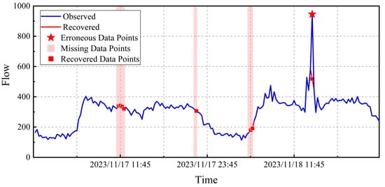 To evaluate the effectiveness of the proposed MPR model, experiments were conducted using the real-world WDS dataset described in Section 5.1. The cleaned and imputed data were used to ensure reliable model training. To simulate real-time recovery, the most recent 960 time points (equivalent to 10 days) were selected as the test set, where the corresponding observations were intentionally masked and treated as missing. For each missing point, the associated feature matrix at that time was input into the MPR model for recovery. The recovered values were then compared with the original observations to assess reconstruction accuracy.
