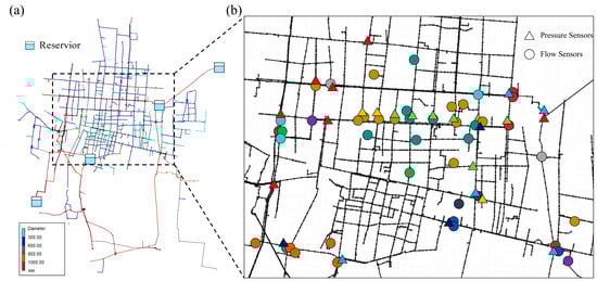 Topology of the water distribution network and grouped sensor deployment. (a) Schematic of the water distribution network topology showing pipe diameters and reservoir locations. (b) Spatial distribution and grouping of sensors in the urban area, where circles represent pressure sensors and triangles represent flow sensors. Sensors with the same color belong to the same group.