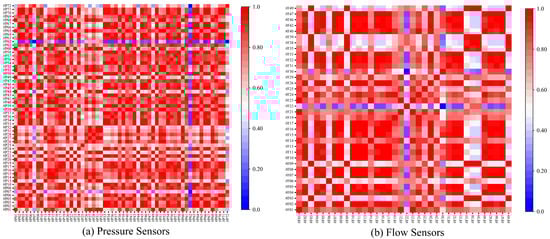 The Pearson correlation coefficient was used to quantify pairwise relationships among sensors, forming a distance matrix . In this study, pressure and flow sensors are denoted as #P and #F, respectively (e.g., #P01 represents pressure sensor #01, and #F01 represents flow sensor #01). Figure 3 visualizes the temporal correlation between every two pressure or flow sensors in the network.