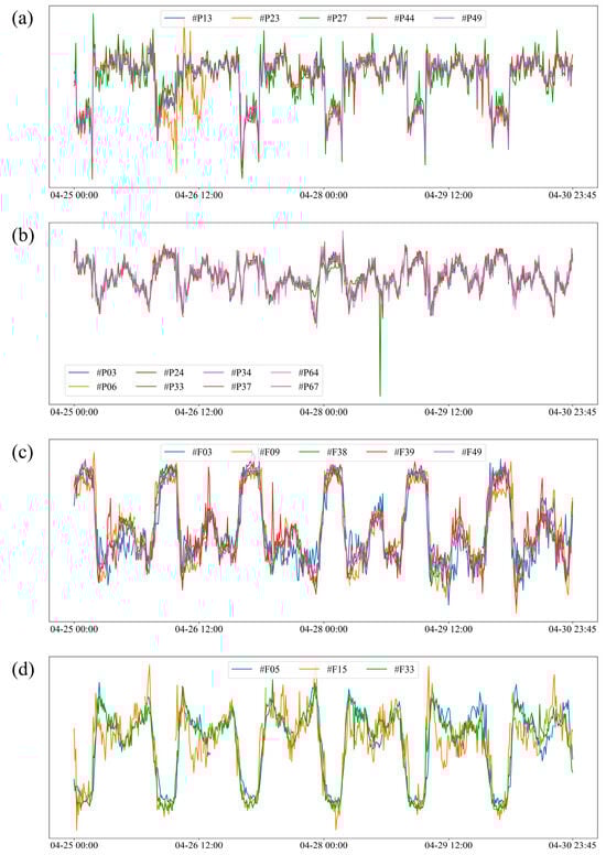 Figure 4 illustrates representative temporal sequences from four groups (pressure groups 7 and 8, flow groups 17 and 19). Sensors within the same group exhibit highly consistent variation trends, confirming the effectiveness of the grouping method. For example, in Figure 4a, sensor #P23 shows a sudden deviation around 26 April 12:00, differing from other sensors in its group—a sign of possible anomalies or local disturbances. Similarly, in Figure 4b, flow sensor #F24 shows an extreme short-lived spike compared with its group peers. These cases highlight the potential of sensor grouping to support anomaly detection and improve the interpretability of monitoring data.