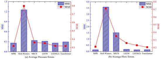 A systematic comparison of data recovery performance was conducted across six representative models by computing the MSE and MAE for both pressure and flow sensors. The experimental design was consistent with that described in Section 5.3, using a 960-step single-point recovery setup. For deep learning models including MICN, LSTM, LSTMs2s, and Transformer, the hyperparameters were tuned for stable convergence, with a learning rate of 0.001, batch size of 32, dropout rate of 0.9, and early stopping at 15 epochs.