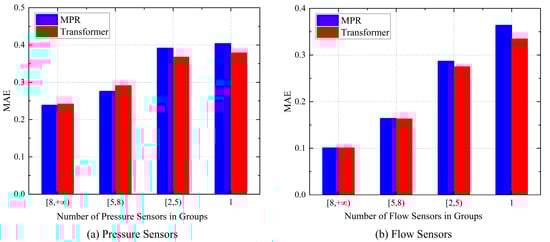 To validate this observation in more detail, the statistical results in Figure 6 provide a deeper validation of the aforementioned strategy. The results indicate that although both the MPR and Transformer models experience a decline in data recovery performance as the number of sensors decreases, the MPR model is more sensitive to changes in sensor quantity, exhibiting a more pronounced performance drop. In contrast, the Transformer model’s performance degradation is comparatively smaller. Additionally, for pressure sensor data recovery, the Transformer model’s accuracy is significantly lower than that of the MPR model. In contrast, for flow sensor data recovery, the Transformer model outperforms the MPR model. These findings highlight the significant differences in model performance across different sensor types, suggesting that appropriate model selection should be based on the specific application context.