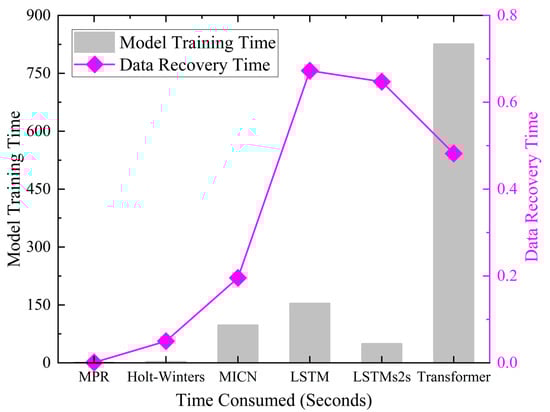 Traditional statistical methods such as Holt–Winters require minimal data representation learning, resulting in shorter training time than neural networks, but they still consume more time than MPR due to the need for repeated smoothing and recursive calculations at each recovery step. Among the deep models, MICN and LSTMs2s demonstrate relatively moderate computational costs compared with Transformer, yet they remain two to three orders of magnitude slower than MPR.