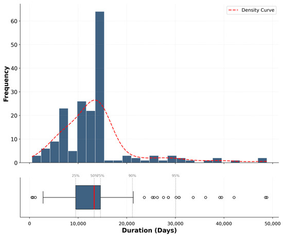 The data from the gages span a considerable range of durations (see Table 1 and Figure 3), with the longest continuous record extending 48,823 days (approximately 134 years), while the shortest record is 509 days (about 1.4 years). The median duration of 13,694 days (around 37.5 years) indicates that at least half of the gages have over three decades of data. Furthermore, the interquartile range, spanning from 9943 days (25th percentile) to 14,700 days (75th percentile), suggests that half of the gages have between 27 and 40 years of data, with 75 percent having more than 27 years of data. The mean duration of 13,803 days (37.8 years) closely aligns with the median, indicating a relatively normal distribution of record lengths across the 182 analyzed gages, though the histogram indicates the distribution is right-skewed, with a long tail towards the gages with longer records.
