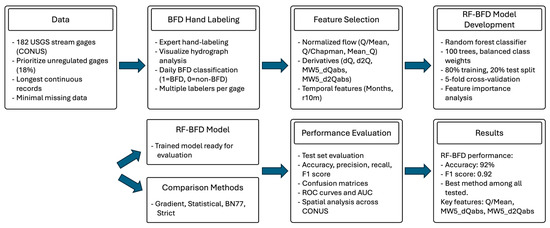 Our methodology consists of five main steps: (1) selection of 182 USGS stream gages across CONUS representing diverse hydrological settings (described in the Section 2 above), (2) Hand-labeling of daily streamflow records to create ground truth BFD classifications, (3) feature selection to extract hydrological characteristics from streamflow time series, (4) development and training of the RF-BFD model using Random Forest classification with cross-validation, and (5) comprehensive performance evaluation comparing RF-BFD against four alternative methods. Figure 4 illustrates this complete methodological workflow from data collection through performance evaluation. Each of these steps is explained in detail in the following sections.
