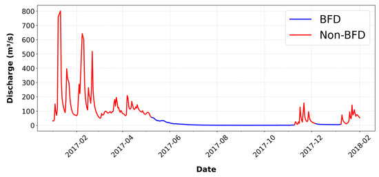 Example of the automated BFD identification process for USGS gage 11,473,900 (2017), with blue periods indicating identified BFD periods (BFD = 1) and red periods indicating non-BFD periods (BFD = 0).