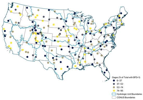While precipitation and the resulting quick flow dominate higher streamflow conditions, many stream reaches experience periods where baseflow, primarily from subsurface contributions, dominates the streamflow [2,3]. These baseflow-dominant (BFD) periods mostly occur during low-flow conditions but can occur at other times, for example, during wet periods, but sometimes after a precipitation event. Flow can be BFD, but not necessarily in the low portion of the flow duration curve. Understanding BFD periods is essential for improving flow forecasts at a continental scale when flow conditions are not dominated by precipitation-driven flow, as most hydrologic models route water from precipitation events, with very simple process models, if any, for baseflow. Many different hydrologic processes can contribute to BFD periods. For example, BFD periods could be characterized by the stream either gaining or losing flow to groundwater, bank storage, or residual flow in the channel. Recession curve behavior after a precipitation event may also involve other processes not captured in current routing methods that may be considered as BFD periods [16].