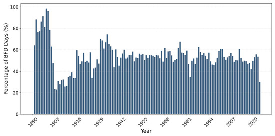 To estimate accuracy, we used 5-fold cross-validation, which systematically trained and tested the model across 5 different data subsets. During cross-validation, we evaluated multiple performance metrics, including accuracy, precision, recall, F1-score, and classification reports for each fold. This approach provides multiple measures of model performance rather than a single accuracy estimate based on one test set. By training the model on different portions of the dataset and evaluating it on the held-out portions, cross-validation helps assess how well the model generalizes to unseen data, providing insight into whether the model is adequately capturing underlying patterns or merely memorizing the training data. This comprehensive evaluation framework enabled us to confidently assess the model’s ability to identify BFD periods across diverse hydrological conditions. The final model was trained on all the available data.