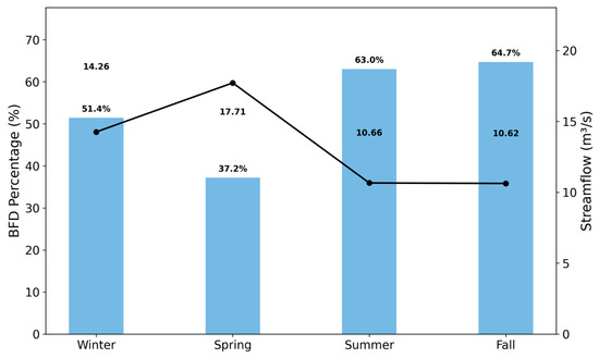 From this set of candidate features, we used the feature importance metrics inherent in the Random Forest algorithm to select the final model features. The feature importance metric in scikit-learn’s RandomForestClassifier calculates importance based on the mean decrease in impurity (MDI), measuring how effectively each feature reduces classification uncertainty across the ensemble of decision trees. Features with higher importance scores demonstrate greater discriminative power in identifying BFD periods, allowing us to systematically eliminate less influential features while maintaining model performance. This data-driven approach to feature selection, combined with hydrological domain knowledge, provided insights into which characteristics most strongly identify BFD periods while ensuring the model remained computationally efficient and interpretable [33].