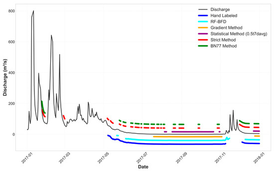 The labeling process followed established principles from graphical hydrograph separation methods [9,30]. Our approach involved identifying relatively flat periods or periods without large changes, by visually analyzing recession limbs to determine when quickflow from precipitation events had passed, i.e., the smooth slope characteristics that are typically associated with BFD periods. As illustrated in Figure 5, we classified BFD periods by considering several criteria. Firstly, the streamflow values classified as BFD should typically be lower than the average, indicating periods where quickflow contributions are less prominent. Additionally, flow classified as BFD should be located in sections of the hydrograph where flow values are relatively stable over time with minimal changes, as significant fluctuations typically indicate recent rainfall or other precipitation events. Finally, we considered the slope of the flow curve to help identify the transitions between BFD and precipitation-influenced flow regimes by examining how the streamflow rate transitions from decreasing (negative slope) to stable (near-zero slope) to increasing (positive slope).