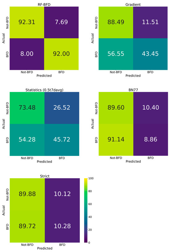 We used a Random Forest classifier, which is an ensemble learning technique that constructs multiple decision trees to improve predictive performance, to develop a model which we call “RF-BFD” to classify flow measurements as BFD or non-BFD [31,32]. We implemented the RF-BFD model using scikit-learn’s RandomForestClassifier with 100 trees, unlimited depth, minimum 2 samples per split, minimum 1 sample per leaf, balanced class weights, and Gini impurity splitting criterion. We used standard Random Forest hyperparameters without extensive tuning, as the algorithm is relatively robust to hyperparameter choices and our primary focus was on feature engineering and interpretability rather than marginal performance optimization through hyperparameter search. We standardized the model features using StandardScaler prior to training. To evaluate model performance, we used 5-fold cross-validation, which provides a stochastic estimate of model performance by iteratively testing the model on different data subsets on 80% of the data, with final evaluation on a held-out 20% test set.