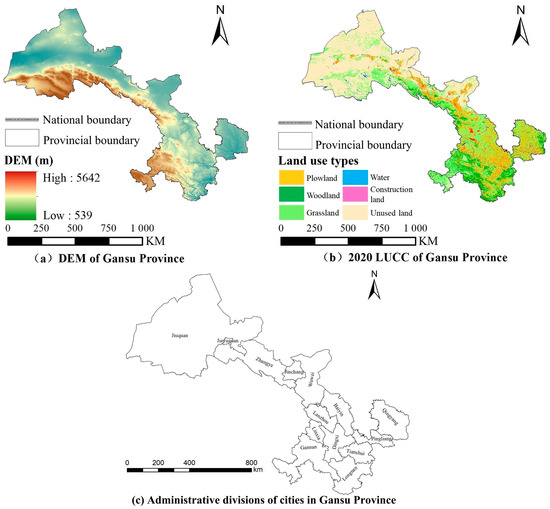 Gansu Province is located in inland Northwest China (32°31′–42°57′ N, 92°13′–108°46′ E), and spans three major plateaus and features a descending topography that includes the Qilian Mountains, Hexi Corridor, Longzhong Loess Plateau, southern mountain regions, and the Gannan Plateau, with an average elevation over 1400 m [23]. The climate shifts from humid in the southeast to arid in the northwest, with annual precipitation ranging between 50 and 800 mm and evaporation reaching 1000–3000 mm [24]. Water resources are structurally insufficient and unevenly distributed, relying heavily on glacial meltwater from the Qilian Mountains. Major rivers belong to the Yellow River, Yangtze River, and inland basins, with inland streams such as the Heihe and Shiyang rivers critical to sustaining oasis ecosystems in the Hexi Corridor. This limited water carrying capacity starkly contrasts with growing socio-economic demands, exacerbated by ongoing urbanization. In 2024, the province recorded a GDP of CNY 1.3 trillion and a permanent population of 24.58 million, further intensifying pressure on water resources. Figure 1 presents information relevant to Gansu Province, wherein (a) displays the Digital Elevation Model (DEM) of the study area, and (b) shows the distribution of land use types in the province for the year 2020.