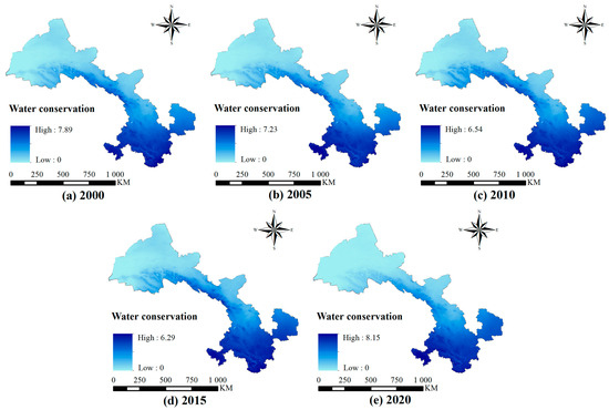 Based on LUCC data, forests and grasslands in Gansu are mainly concentrated in the southern Qinling and eastern Qilian Mountain regions. The high vegetation coverage in these areas enhances the retention and conservation of natural rainfall and surface water resources, contributing significantly to regional water balance. However, a comparison between the years 2000 and 2020 reveals noticeable ecosystem degradation in northern Gansu, where water conservation capacity has further declined. Moreover, due to urban expansion, construction land has increasingly encroached on forest and grassland areas. As a result, the water conservation service capacity has also decreased in major urban centers, including Lanzhou.